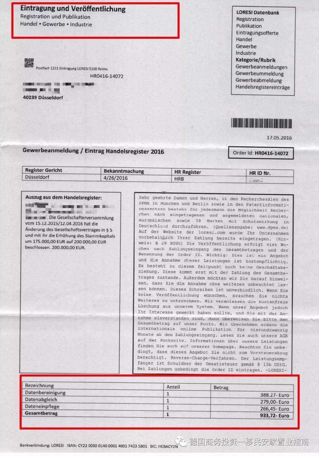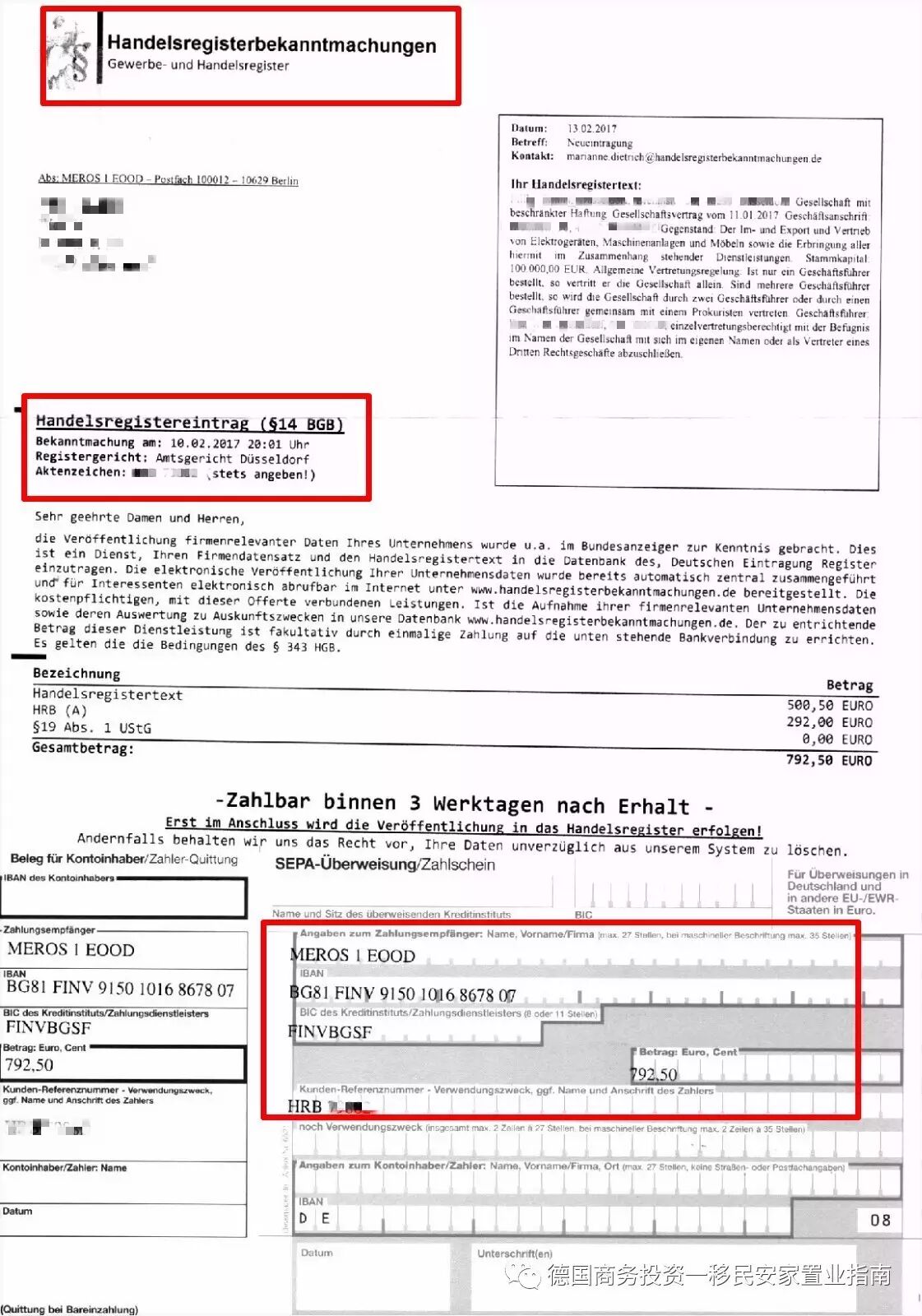 在德国有限责任公司(GmbH)公司成立完毕以后,公司信息会发布在德国发布公司信息的官网上,然而这些信息的对外公布也给一些不法公司创造了创造了骗钱的机会。他们利用新公司尤其是海外投资人不了解德国商业规则的弱点,给新公司发送带误导性或欺诈性的信件,给投资带来经济上的损失。